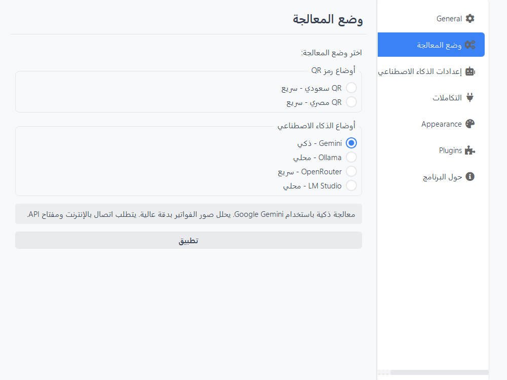 3. اختر وضع معالجة Ollamaفي قارئ الفواتير، انقر على زر وضع المعالجة واختر OLLAMA – بطيء، ثم انقر على تطبيق.